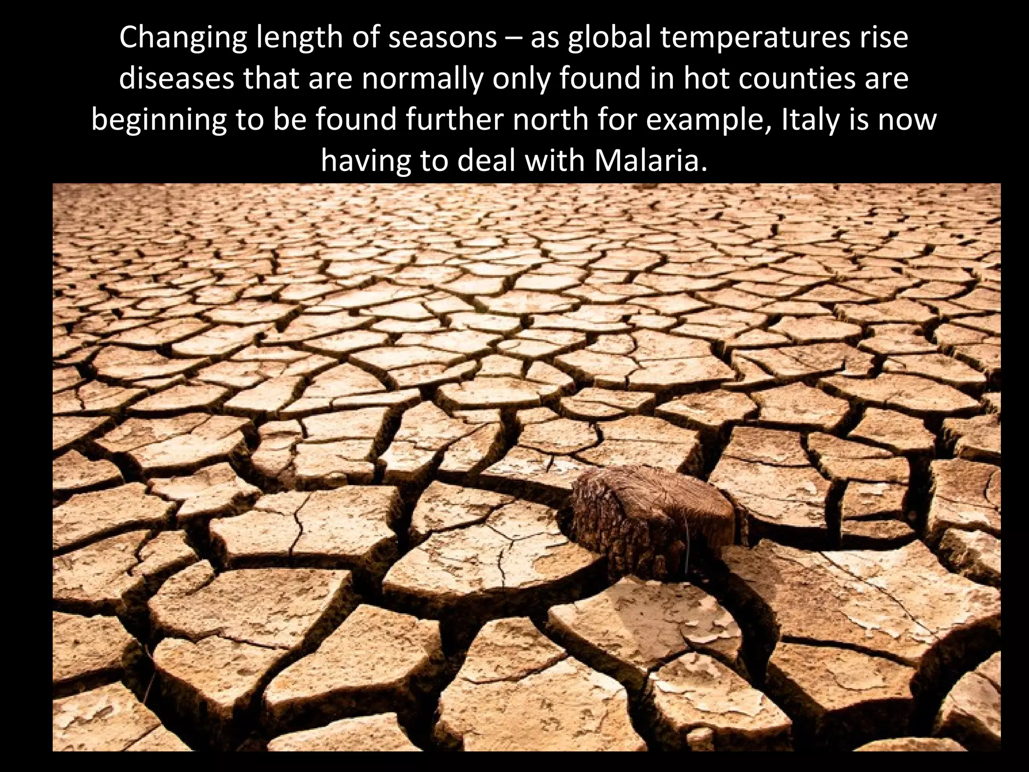 Climate change is causing negative effects like changing seasons that allow diseases to spread farther north, changing rainfall patterns, and more frequent/intense hurricanes, tornadoes, and floods. Higher temperatures are warming oceans and allowing hurricanes to be stronger and more destructive. Climate change also threatens global food supply by potentially reducing crop yields through more droughts and floods, and could lead to food shortages and famine in poorer regions if harvests decline. Coastal cities face flooding risks from rising sea levels.