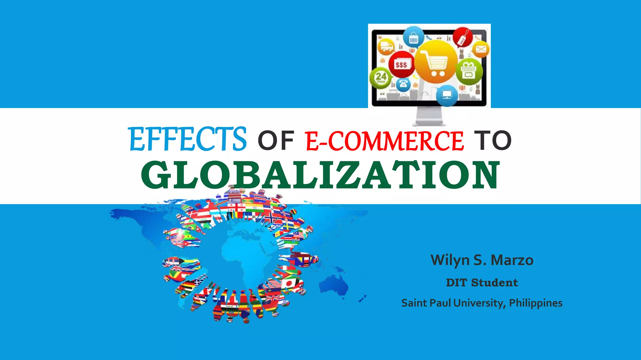 This document discusses how e-commerce has contributed to globalization through the use of information technology. It defines key terms like globalization, information technology, and e-commerce. E-commerce enables various types of online transactions between businesses and consumers. Features of e-commerce include non-cash payments, 24/7 availability, improved marketing and sales, and inventory management. The World Trade Organization establishes rules for international trade, including e-commerce, to ensure its benefits are accessible worldwide. Developing nations must gain access to technology to effectively engage in the digital economy.