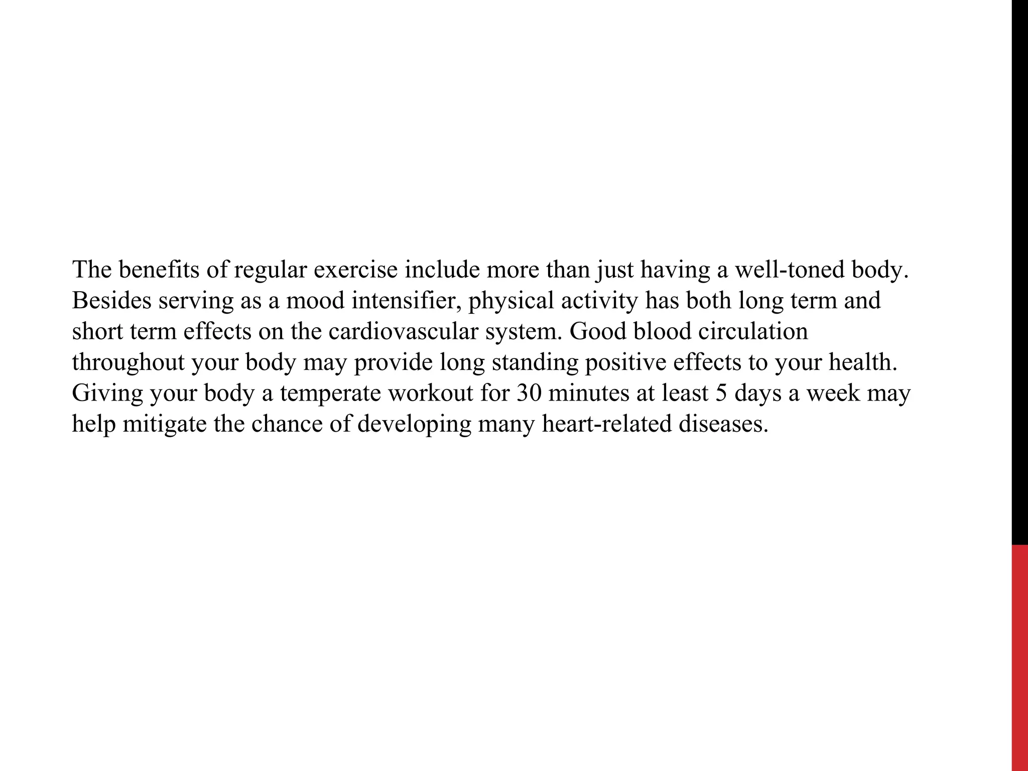Regular exercise has both short-term and long-term benefits for the cardiovascular system. It increases stroke volume and lowers resting heart rate, making the heart stronger and more efficient. Exercise also lowers blood pressure and improves blood flow, directing more blood to skeletal muscles. Long-term, it enhances blood vessel lining and lowers the risk of plaque buildup. The first part of the body to benefit from regular exercise is the heart.