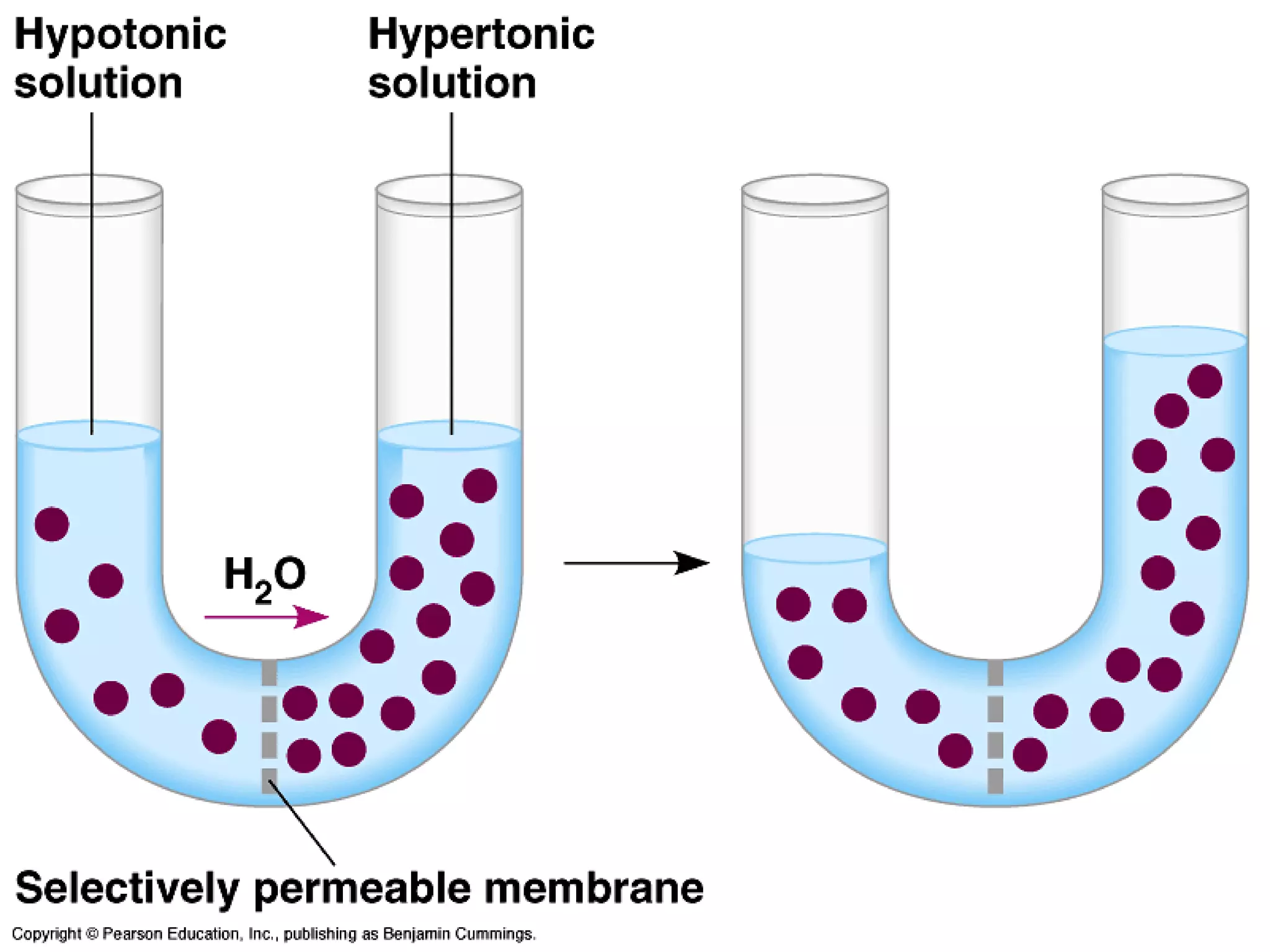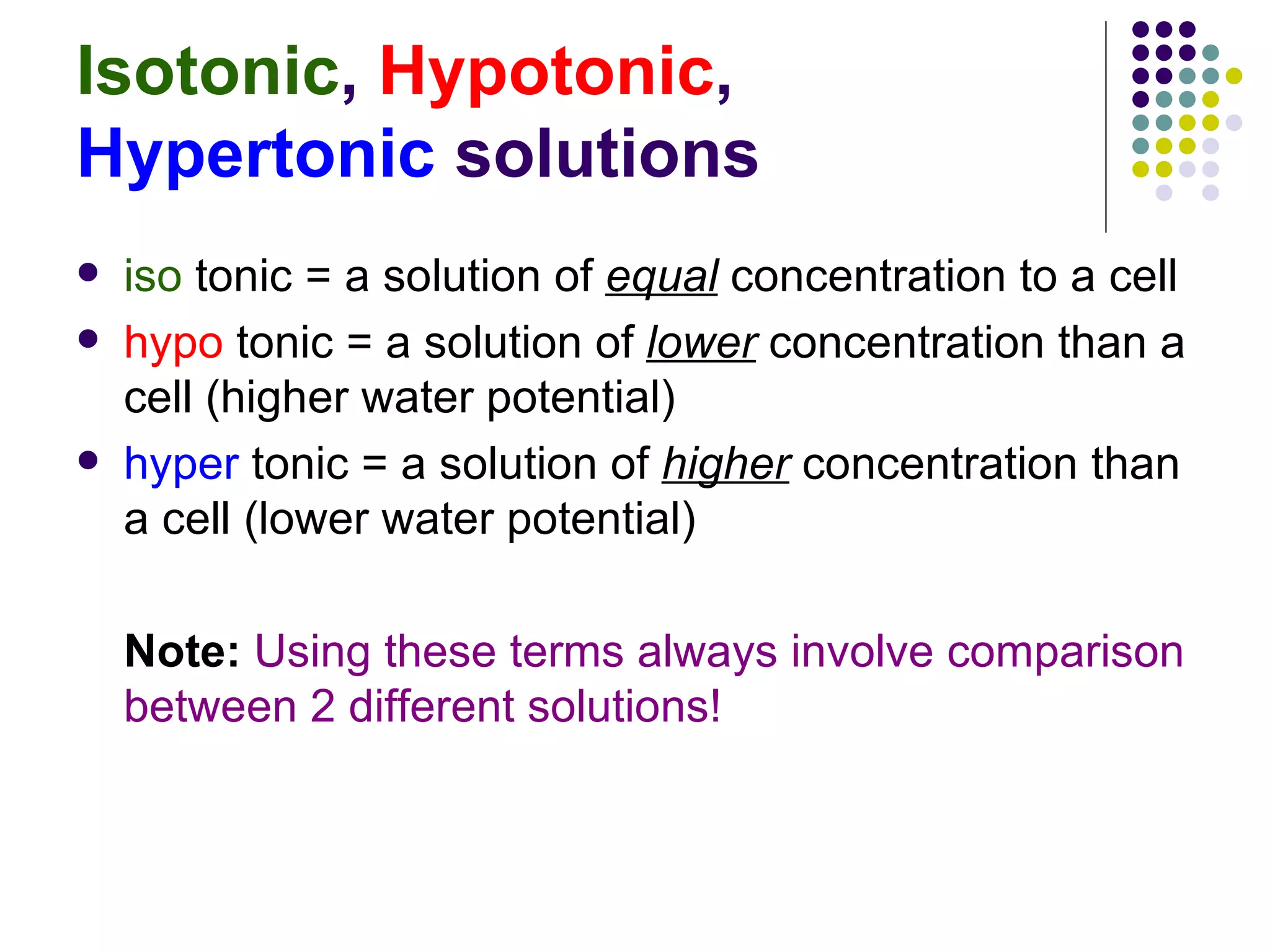An isotonic solution has an equal concentration to a cell, so there is no net movement of water into or out of the cell. A hypotonic solution has a lower concentration than a cell, so water will move into the cell by osmosis, causing it to swell. A hypertonic solution has a higher concentration than a cell, so water will move out of the cell by osmosis, causing it to shrink or crenate.