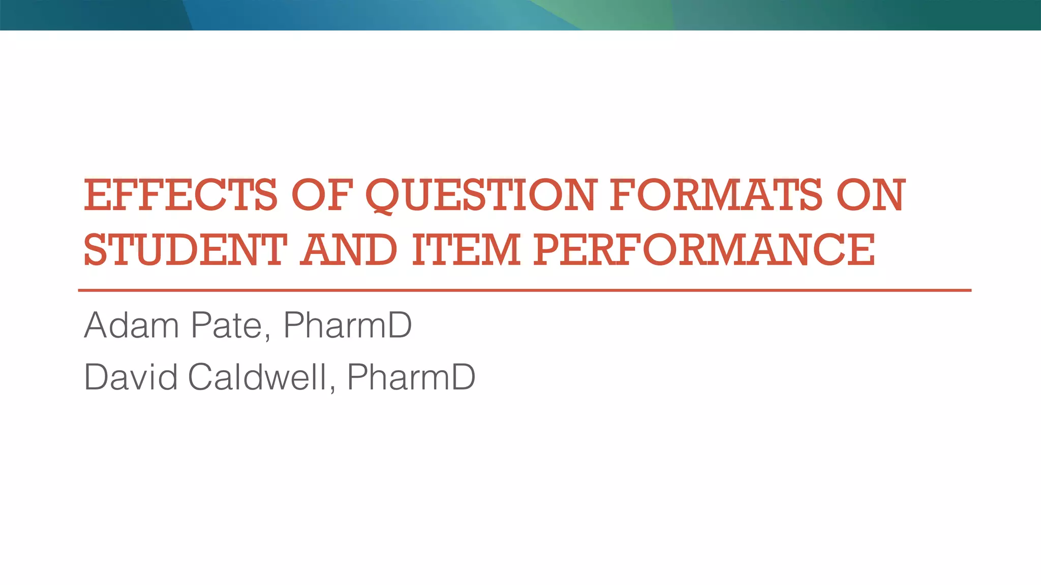 The document discusses the effects of different question formats on student performance, presenting guidelines developed from an analysis of various textbooks and research studies. Key recommendations include using positive phrasing, creating plausible distractors, and carefully utilizing options like 'none of the above' and 'all of the above.' Research analysis indicates that effective distractors enhance item discrimination without affecting difficulty.