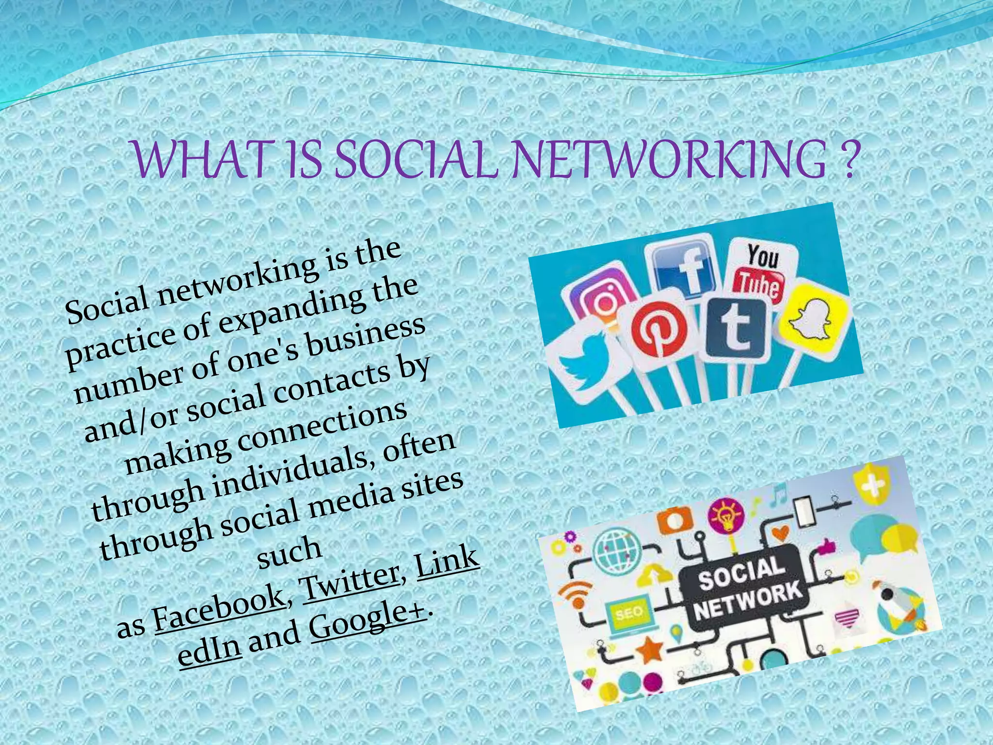 The document provides an overview of the history and evolution of social networking sites, beginning with the first email sent in 1971 and highlighting significant platforms like Geocities, MySpace, and Facebook. It discusses the advantages of social networking, such as personal expression and staying connected with others, while also addressing disadvantages like cyberbullying and privacy risks. Additionally, it presents interesting statistics regarding social media usage in the United States.