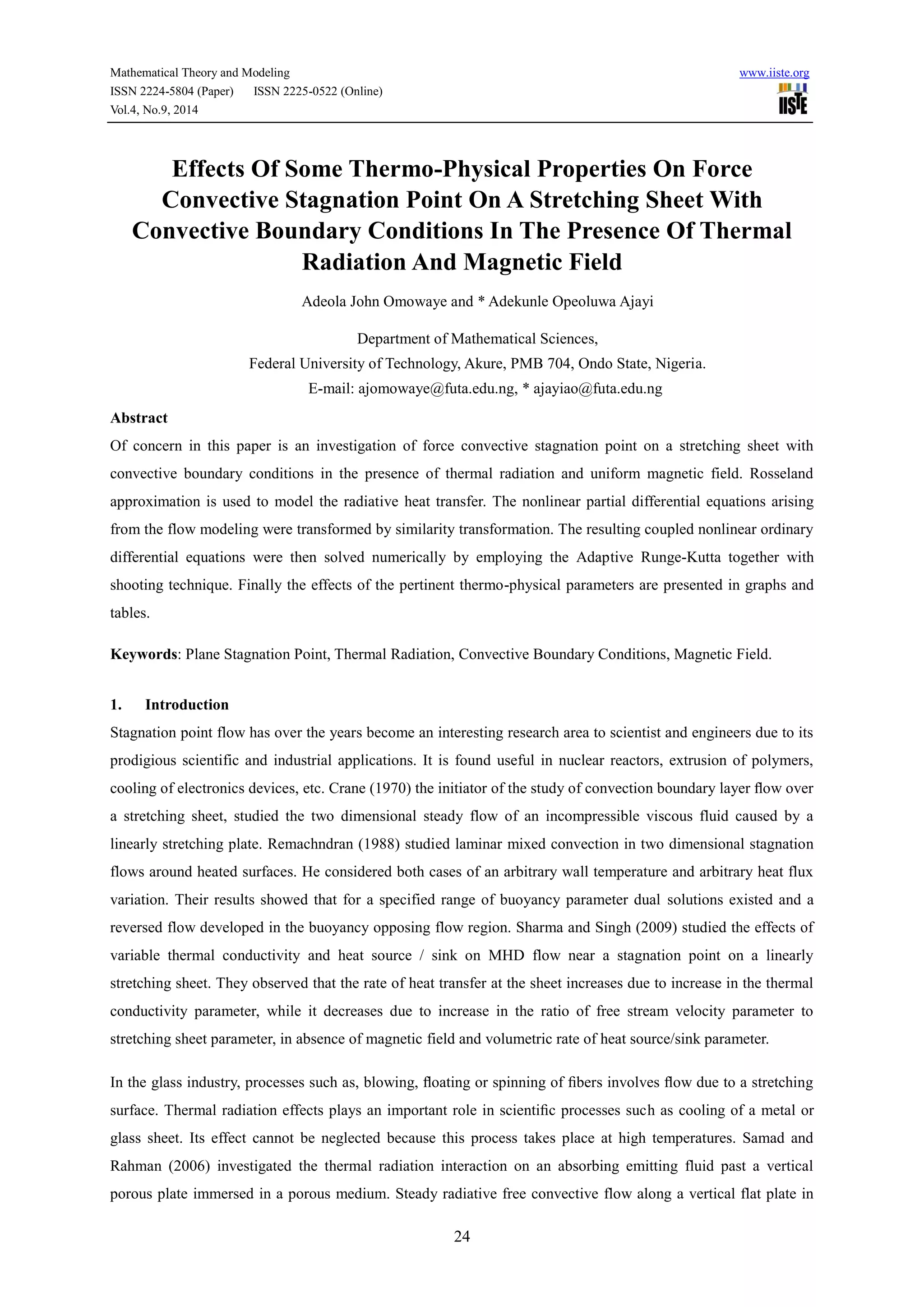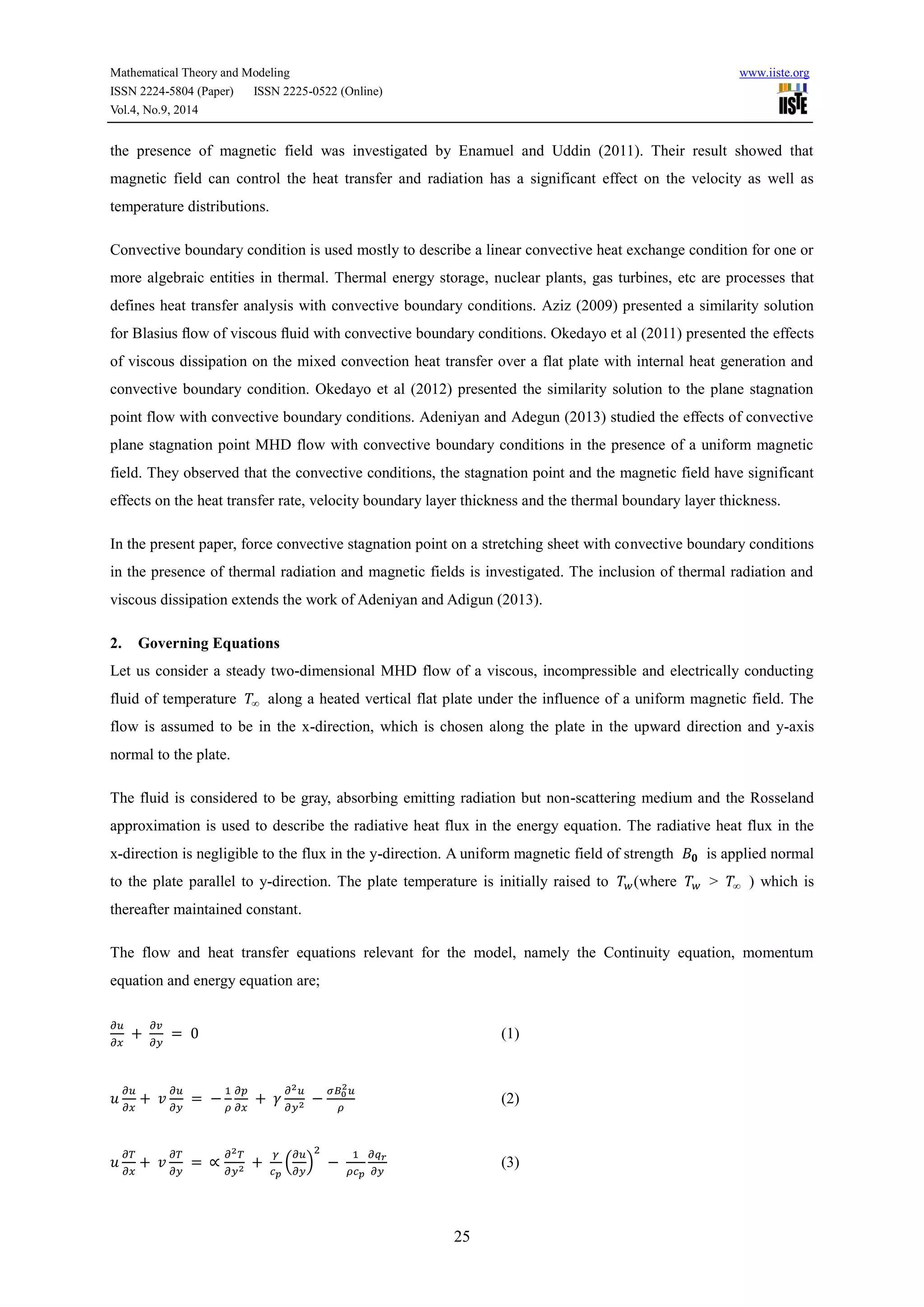 This document presents research on force convective stagnation point flow over a stretching sheet with convective boundary conditions in the presence of thermal radiation and a magnetic field. Governing equations for the flow are derived and non-dimensionalized. The equations are then solved numerically using a shooting method. Results show that increasing the magnetic field parameter decreases velocity, while increasing the Biot number increases temperature. Temperature is also found to decrease with increasing Eckert number, Prandtl number, and radiation parameter. Skin friction coefficient and local Nusselt number are presented for various parameter values.
