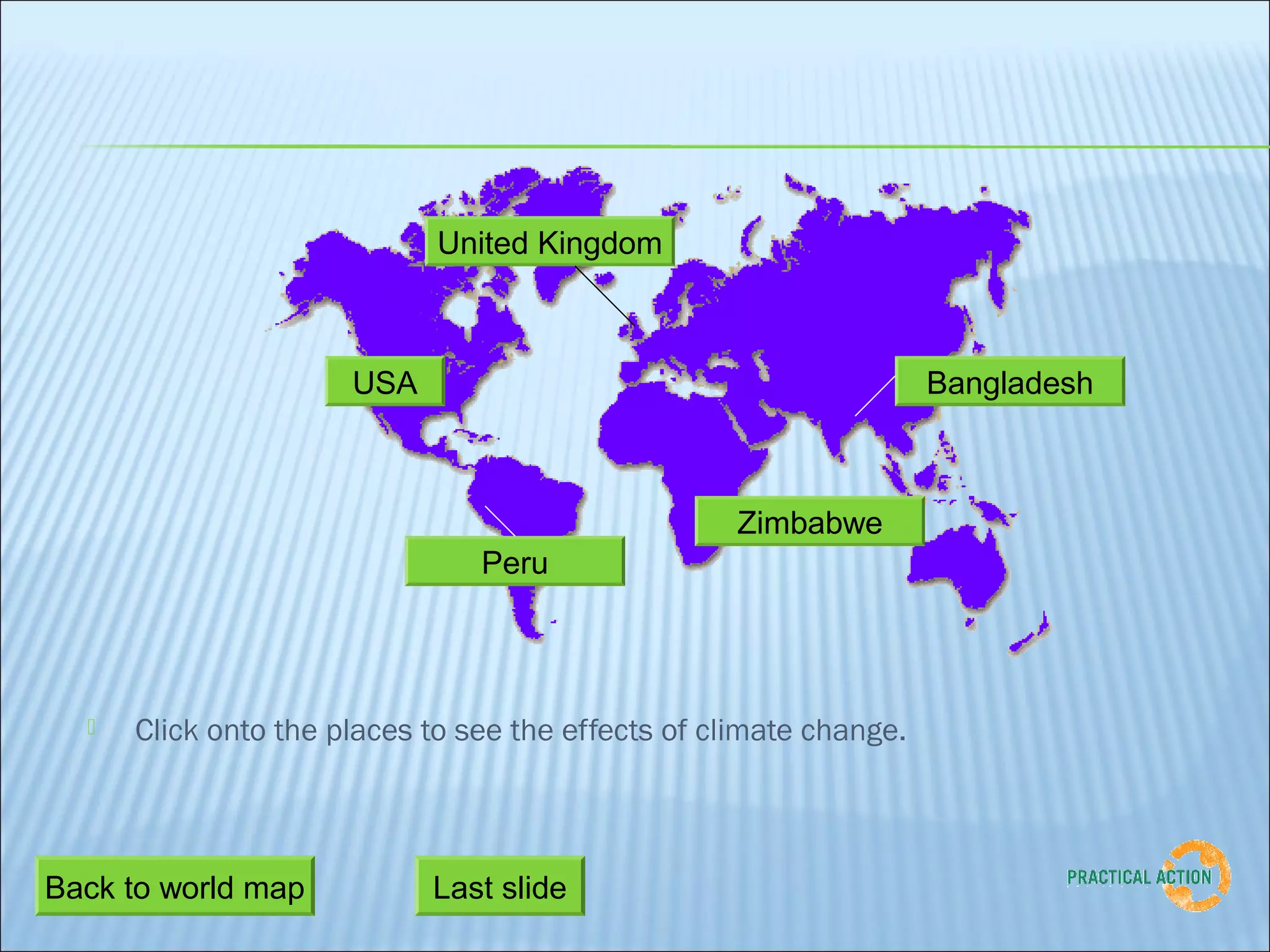 The document discusses how climate change affects different parts of the world. It provides information on the impacts in Bangladesh, Zimbabwe, Peru, the United Kingdom, and the United States. In Bangladesh, climate change is causing worse monsoon rains and flooding that destroys crops, forcing people to move homes multiple times. In Zimbabwe, droughts make surviving difficult for people, crops, and animals by baking the ground hard and preventing water capture. In Peru, less predictable weather is challenging for farming with rains, droughts, and melting snow affecting crops and livestock. The UK experiences heavy rains and flooding, while the US faced devastating hurricanes like Katrina, which scientists link to rising sea levels and stronger storms from global warming.