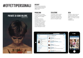 Il documento esplora l'importanza degli effetti personali delle donne e come le detenute, privati di tali oggetti, possano ritrovare identità e valore attraverso la produzione di beni 'made in carcere'. Si propone di comunicare il valore di questi prodotti per sostenere il recupero sociale delle detenute. Si invita a condividere storie personali legate agli oggetti nelle borse attraverso i social media con l'hashtag #effettipersonali.