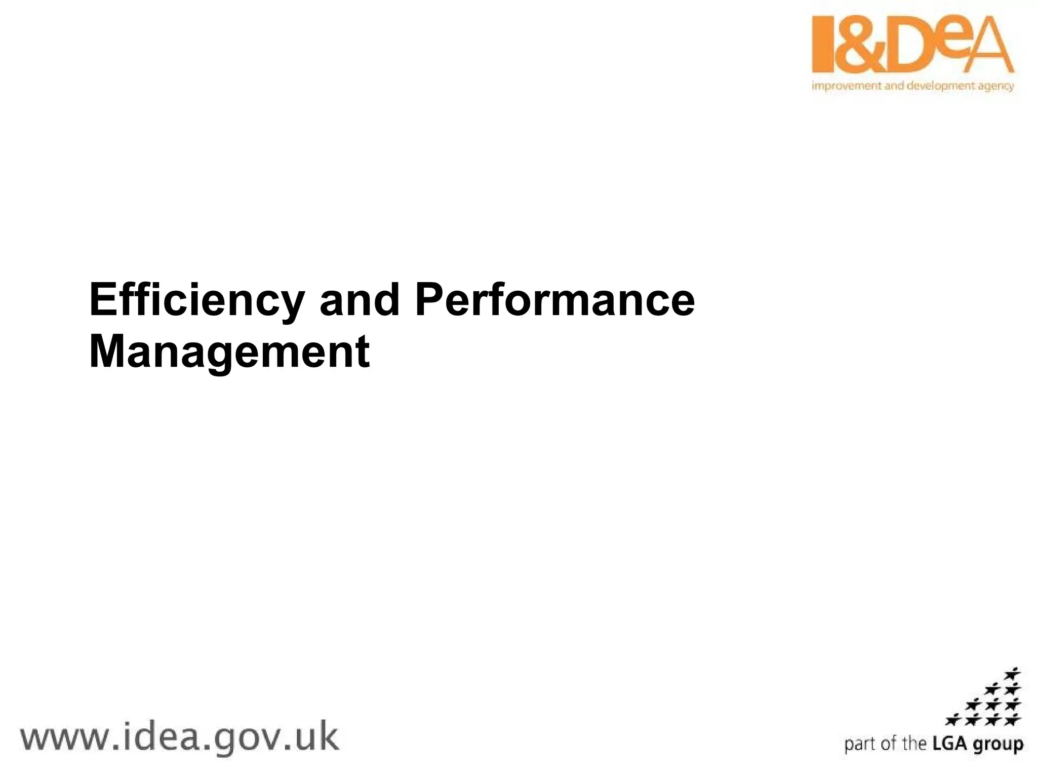 This document discusses efficiency and performance management in the public sector. It outlines three key areas that must be joined up: measures, systems/processes, and people. Potential areas for efficiencies are identified and then pilots are conducted before scaling up. Estimated savings are determined by approaches like service redesign or technology. Benefits are then evaluated using metrics like return on social investment or public value. A case study from Somerset County Council compares the budget size and relative cost/performance of different council services. Key questions are posed around best linking performance, efficiency, and finance; identifying areas for efficiencies; and measuring savings and improvement within partnerships.