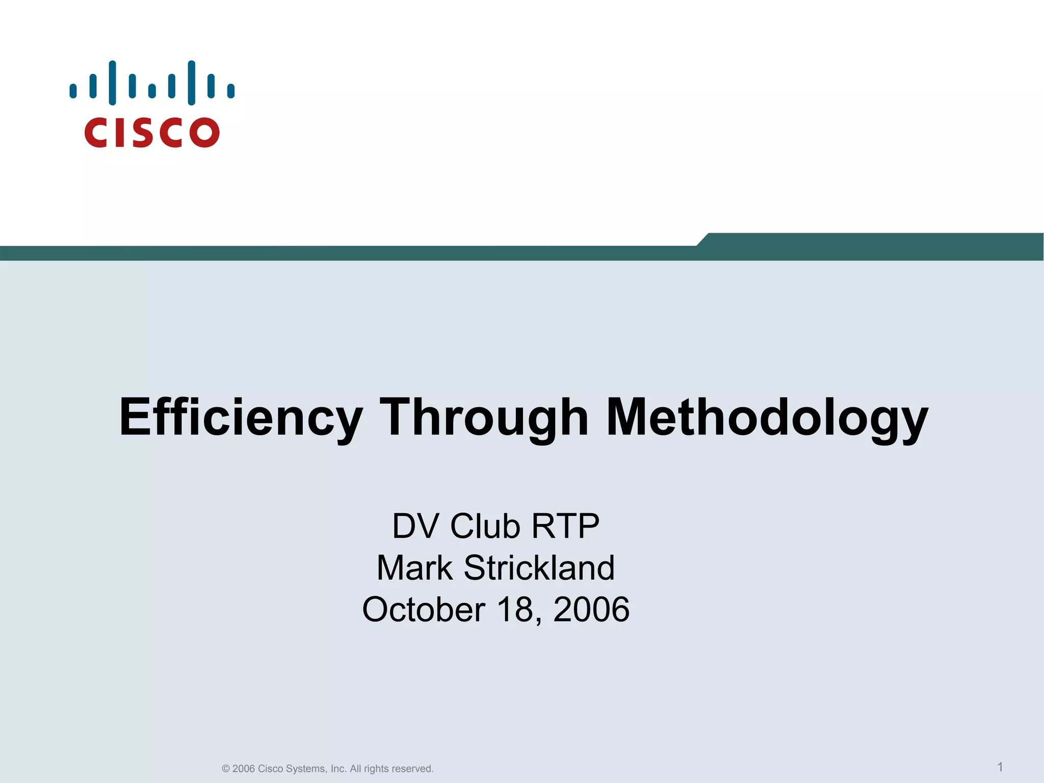 The document discusses methodologies for improving efficiency in verification testing at Cisco, including using reusable components from other projects, avoiding duplicate specifications, providing flexible testbenches, and automating tasks. It provides examples used at Cisco such as separating testbench creation into three stages, using testflow to synchronize component behavior, reusing unit-level checkers, linking transactions between checkers, and generating common infrastructure from templates to reduce designer effort. The biggest efficiency gains come from methodologies that push shared behavior into reusable components and standardize common elements.