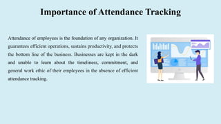 The document discusses the significance of attendance tracking in enhancing organizational productivity and operational efficiency. It outlines various attendance management methods, including traditional time clock systems, biometric systems, and web-based tracking tools, each offering unique benefits. Additionally, it emphasizes the importance of real-time monitoring for optimizing team management and time allocation.