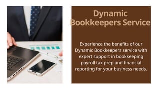 At Dynamic Bookkeepers, we offer professional bookkeeping services tailored to your business needs. Our dedicated team of experts ensures accurate financial management and reporting for your peace of mind.