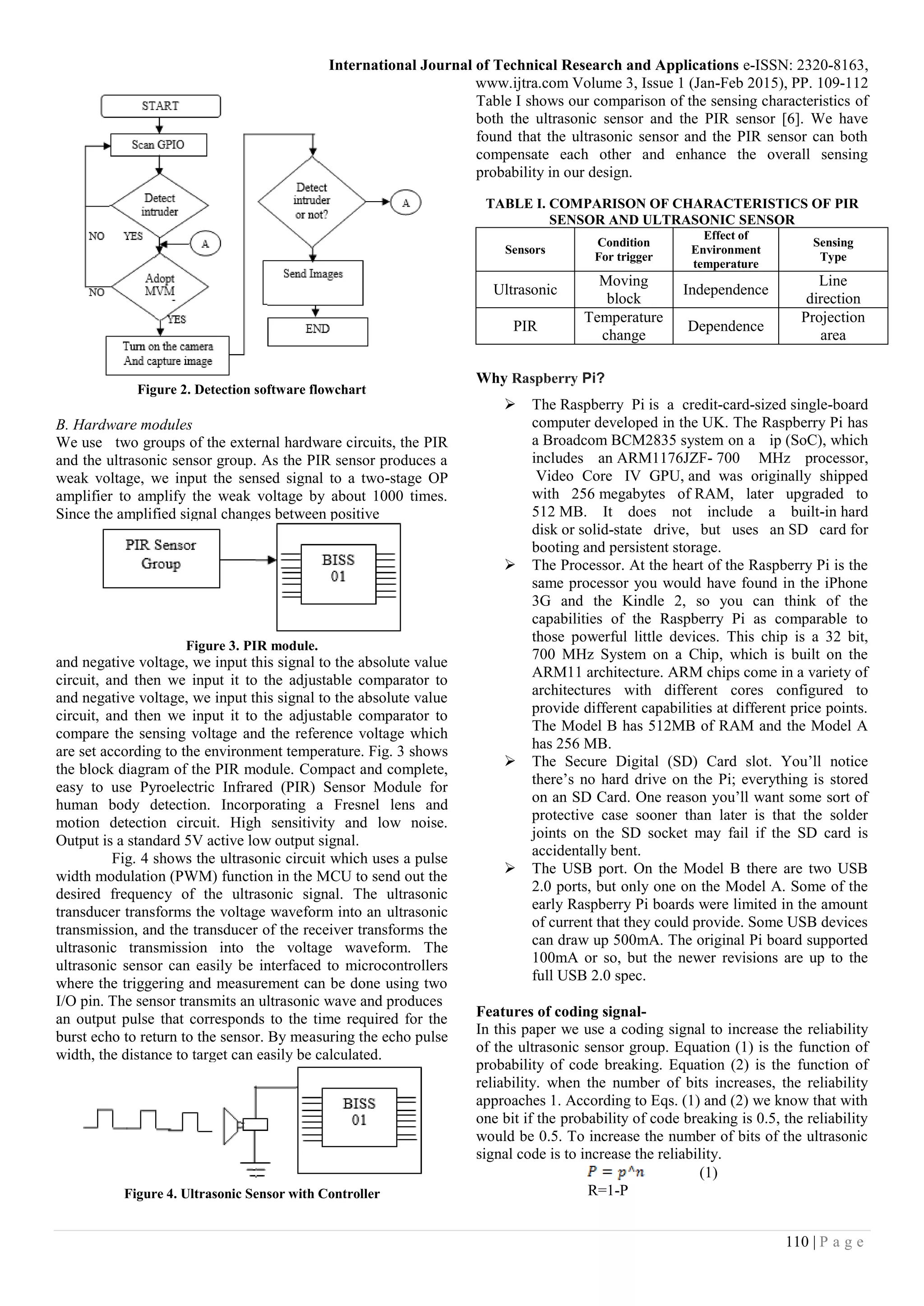 This document describes the design of an efficient embedded surveillance system using smart sensors and a Raspberry Pi. The system uses PIR (pyroelectric infrared) sensors and ultrasonic sensors to detect intruders. When motion is detected, a camera captures images which are then automatically emailed to authorized personnel. This avoids data storage costs and ensures confidential data is not lost. The Raspberry Pi is used to send captured images via the internet. The system aims to improve detection reliability by using multiple sensor types and a majority voting mechanism. It provides remote monitoring capabilities with low power consumption.
