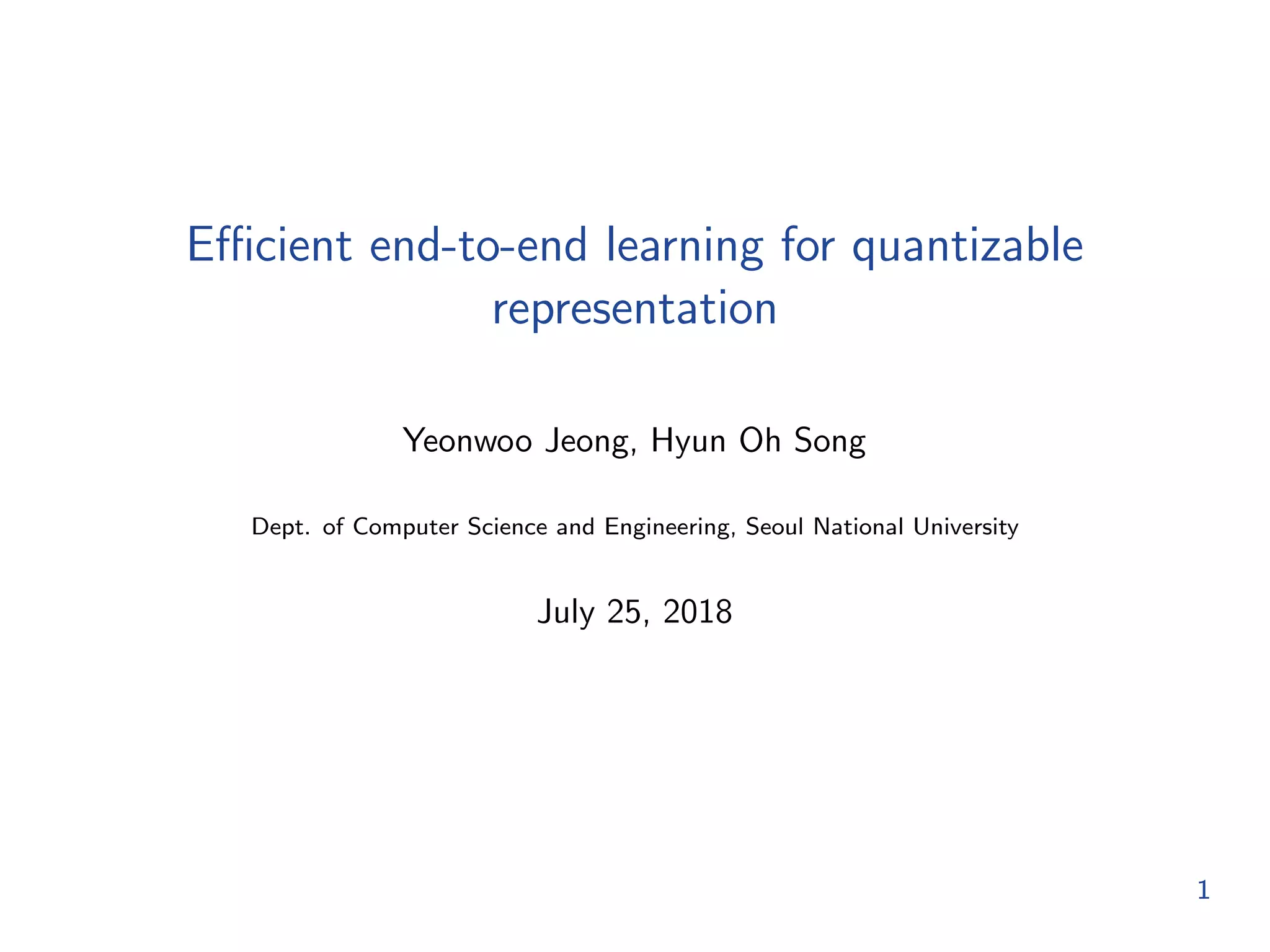 The document discusses efficient end-to-end learning for quantizable representation, focusing on the challenges of image classification with numerous labels and the role of metric learning in addressing these challenges. It presents various methods, including triplet loss and npairs loss, to optimize embedding representations and corresponding binary hash codes, utilizing an alternating minimization framework. The document also outlines experiments comparing proposed methods against baseline approaches to evaluate performance.