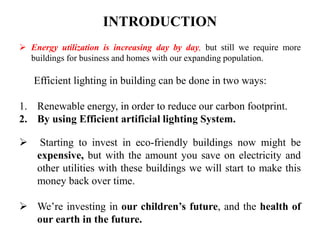 Efficient lighting in buildings can be achieved through renewable energy sources and efficient artificial lighting systems. Several eco-friendly buildings around the world make use of natural lighting, rainwater recycling, and integrated energy systems. Light-emitting diode (LED) bulbs are more efficient than incandescent bulbs, producing flicker-free light while using only 10% of the power. Their long lifetime of 50,000-100,000 hours provides significant energy savings over other lighting options.