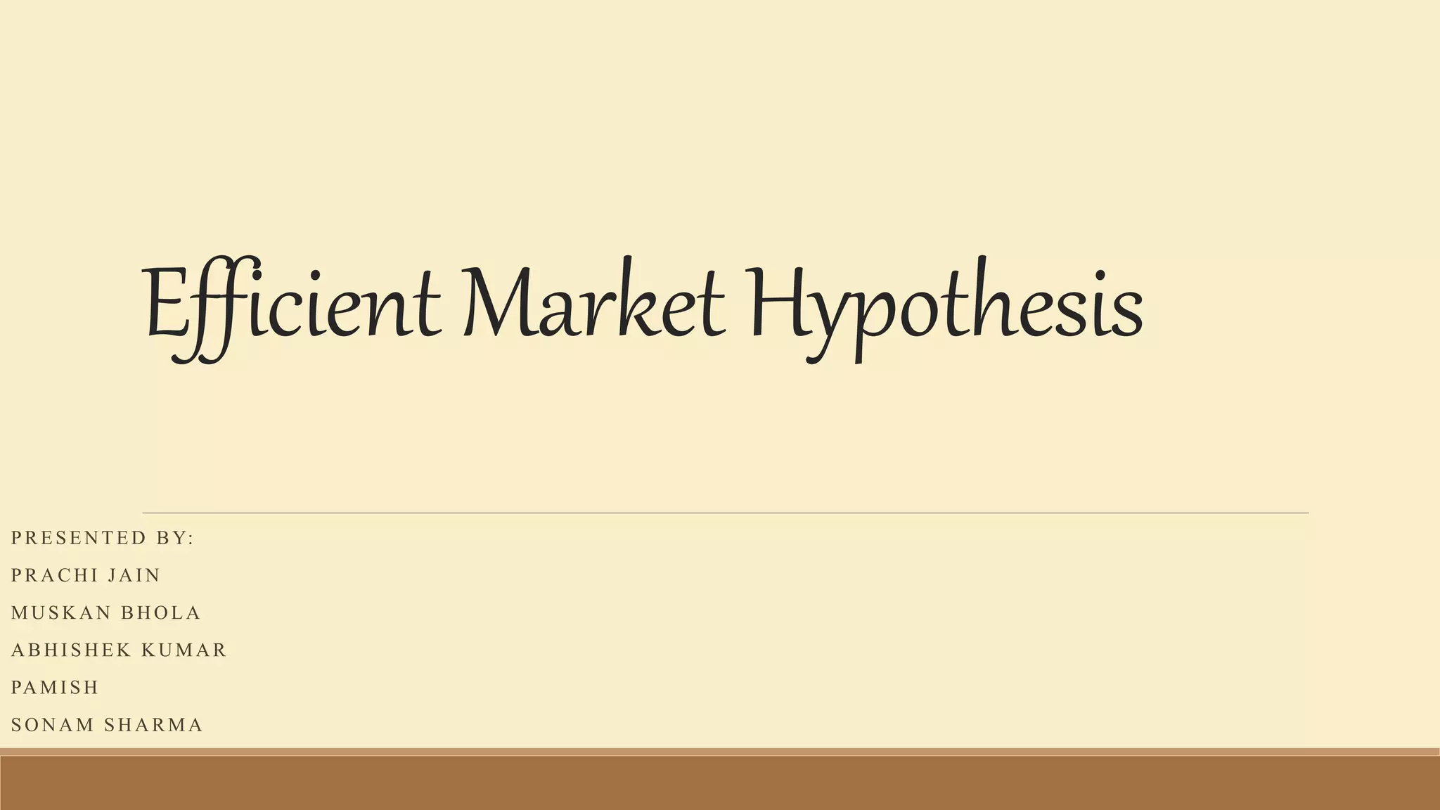 The Efficient Market Hypothesis states that stock prices always reflect all available information and that it is impossible for investors to outperform the market. It has three main assumptions: stocks are traded at fair value, market prices reflect all information, and investors cannot beat the market. There are three types of market efficiency - weak, semi-strong, and strong. The EMH is limited by market crashes, anomalies, and evidence some investors can beat the market. Several anomalies exist, including calendar anomalies like the January effect and turn-of-the-month effect. Fundamental anomalies include the value and size effects. Technical anomalies use techniques like moving averages and trading range breaks.