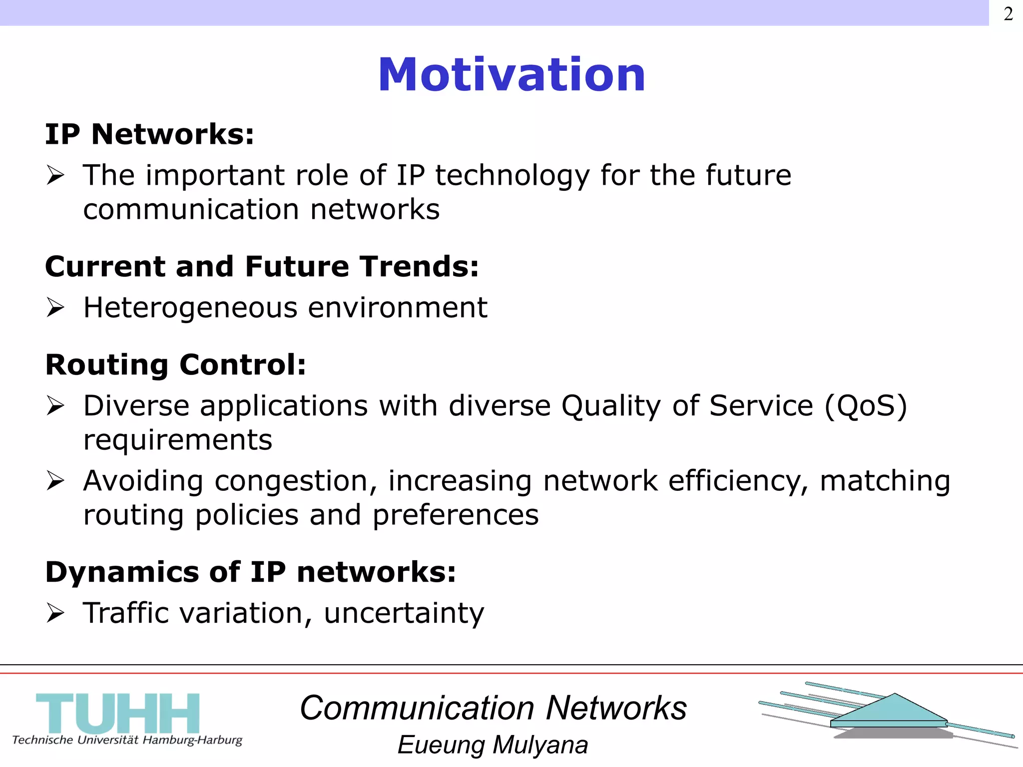 This document discusses routing and traffic engineering approaches for IP networks. It covers several topics: metric-based traffic engineering in classical IP networks using hybrid genetic algorithms; routing and re-optimization under partial demand increases; routing and dimensioning in multi-class IP/MPLS networks with per-class over-provisioning; and heuristic approaches for backup capacity provisioning under demand uncertainty. The document outlines computational studies demonstrating the effectiveness of the proposed approaches.