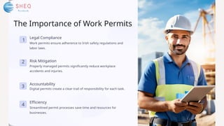 The document introduces a cutting-edge work permit management software designed to enhance safety compliance and streamline operations in Ireland. Key features include a user-friendly interface, real-time updates, and customizable templates, aimed at improving efficiency, accountability, and risk mitigation. The software serves various industries such as energy, healthcare, construction, and manufacturing, with comprehensive training and ongoing support for implementation.