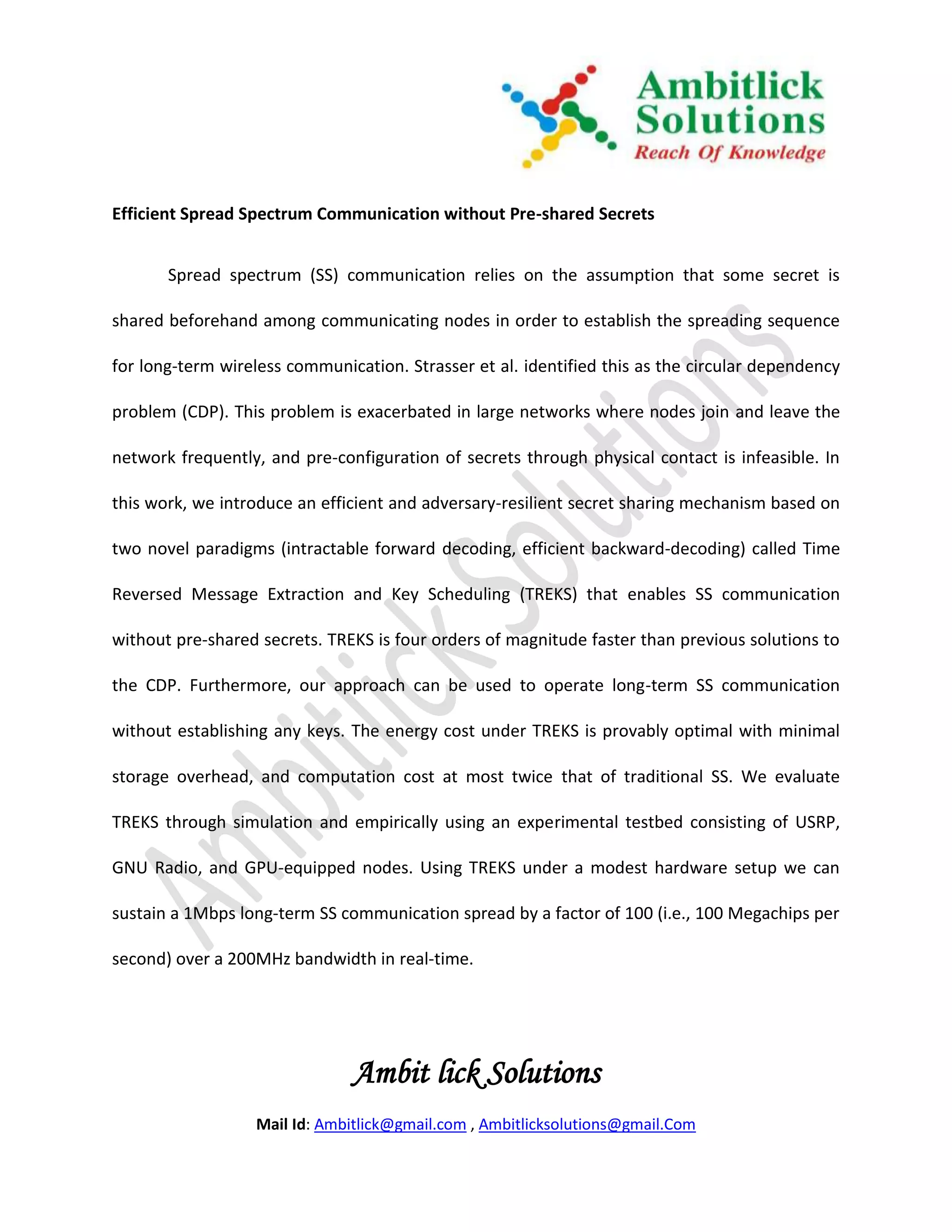 This document proposes a new mechanism called Time Reversed Message Extraction and Key Scheduling (TREKS) that allows for efficient spread spectrum communication without pre-shared secrets. TREKS is four orders of magnitude faster than previous solutions to this problem. It enables long-term spread spectrum communication with optimal energy costs, minimal storage overhead, and a computation cost at most twice traditional spread spectrum. The approach was evaluated through simulations and experiments sustaining 1Mbps communication spread over 100 Megachips per second using modest hardware.