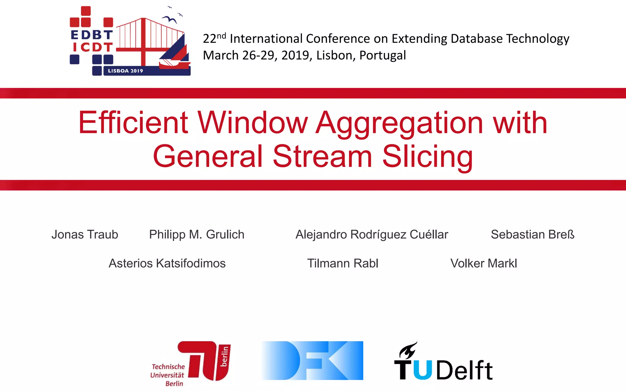 The document discusses efficient window aggregation with general stream slicing in stream processing pipelines, highlighting its advantages in memory efficiency, low latency, and reduced redundancy. It details how stream slicing adapts to workload characteristics and performs well across various aggregation functions, even in scenarios of out-of-order data. Key operations such as merging, splitting, and updating slices are examined to illustrate the technique's adaptability and effectiveness.