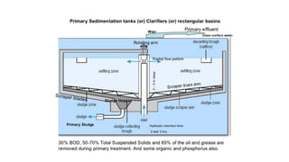 - Primary treatment uses screens to remove floating solids and sedimentation to remove suspended solids. Secondary treatment uses biological processes like activated sludge or trickling filters to further break down organic matter.