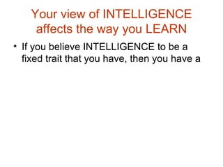 Carol Dweck's research on mindsets indicates that viewing intelligence as a fixed trait leads to a fixed mindset, resulting in avoidance of challenges and low effort, while perceiving intelligence as malleable fosters a growth mindset, encouraging learning and resilience. Praising effort and strategies over inherent intelligence can help children develop a healthy self-esteem and a mastery-oriented response. Effective educational practices include emphasizing learning, challenges, and teaching strategies that promote persistence and improvement.