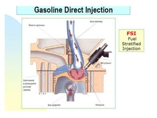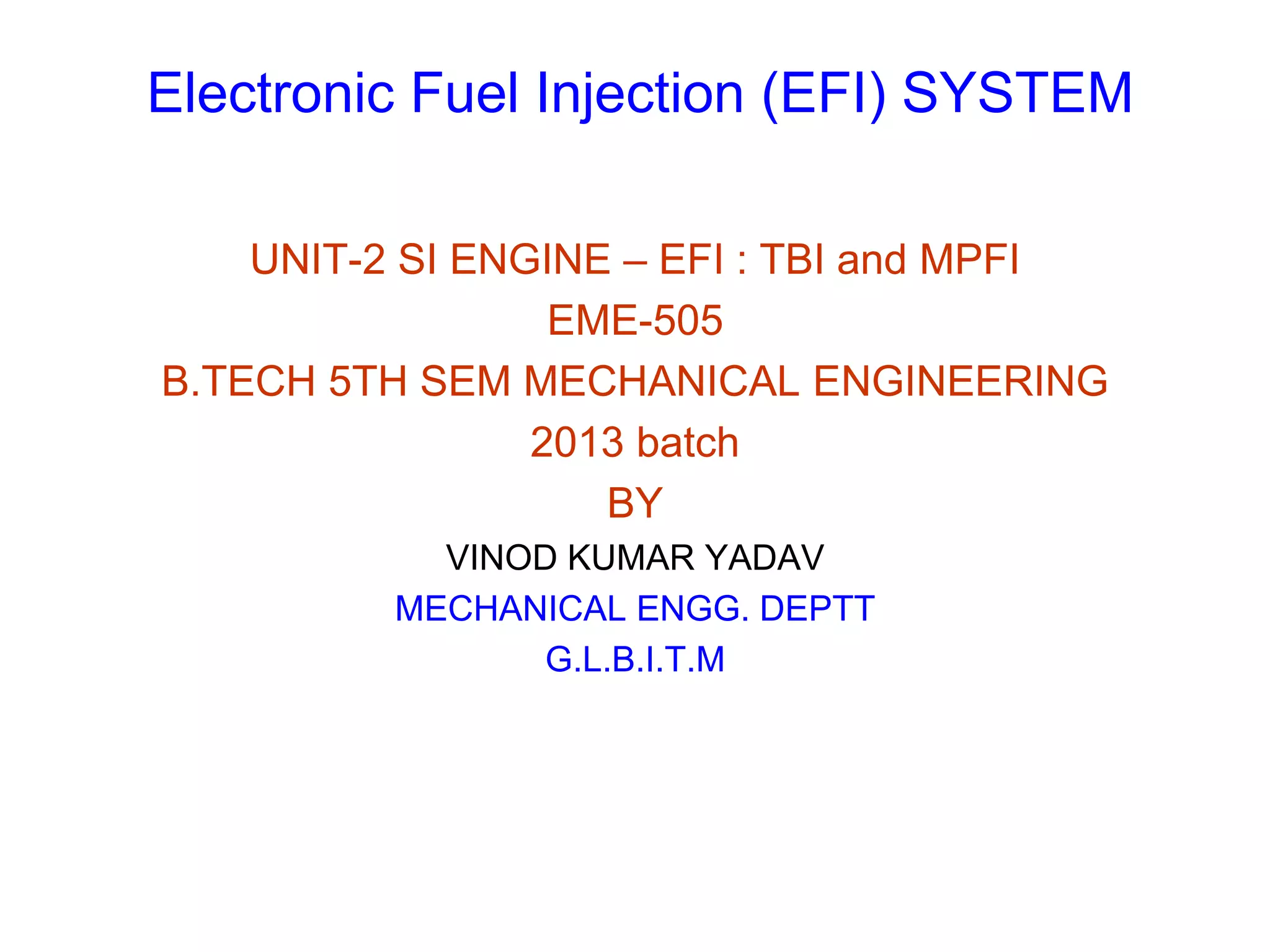 This document provides information on electronic fuel injection systems. It discusses the limitations of carburetors and the need for EFI to provide uniform fuel distribution in multi-cylinder engines. It describes the types of injection systems as single-point/throttle body injection and multi-point injection. The basic components and operation of electronic fuel injectors are explained. The advantages of EFI over carbureted systems are also summarized such as lower emissions and better fuel efficiency.