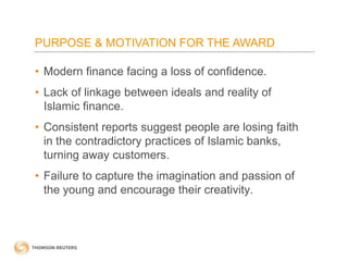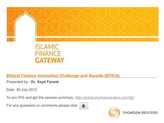 The document discusses the Ethical Finance Innovation Challenge and Awards (EFICA) which aims to address issues facing Islamic finance such as a loss of confidence and failure to capture imagination. It outlines three main awards: 1) The Islamic Finance Industry Development Challenge which aims to develop a more robust ethical structure; 2) The Ethical Finance Initiative Award which encourages true financial innovation based on ethics; 3) The Lifetime Achievement Award which recognizes those who have lived ethics in finance. A process is outlined where applications are accepted until September, shortlisted candidates are mentored and present solutions in November for voting.