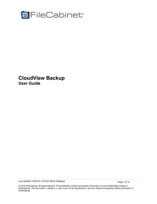 The document is a user guide for the CloudView backup utility offered by eFileCabinet, detailing the system's ability to automatically back up databases and files every 24 hours to an online account. It includes instructions for accessing backup settings, managing cloud account connections, and restoring data in the event of a failure. Additionally, it covers how users can monitor their backup status and access files via a web interface or mobile app.