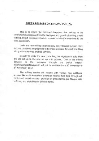 This document informs taxpayers that due to the overwhelming response to e-filing and to take e-services to the next generation, a new e-filing project has been conceptualized. Under the new setup, not only ITR forms but other income tax forms will be available for electronic filing along with other web-enabled services. However, due to data migration from the old system to the new system, e-filing services through the portal will be unavailable from November 3rd to 8th, after which services will resume with multiple filing options, helpdesk support, pre-filled forms, and offline e-forms.