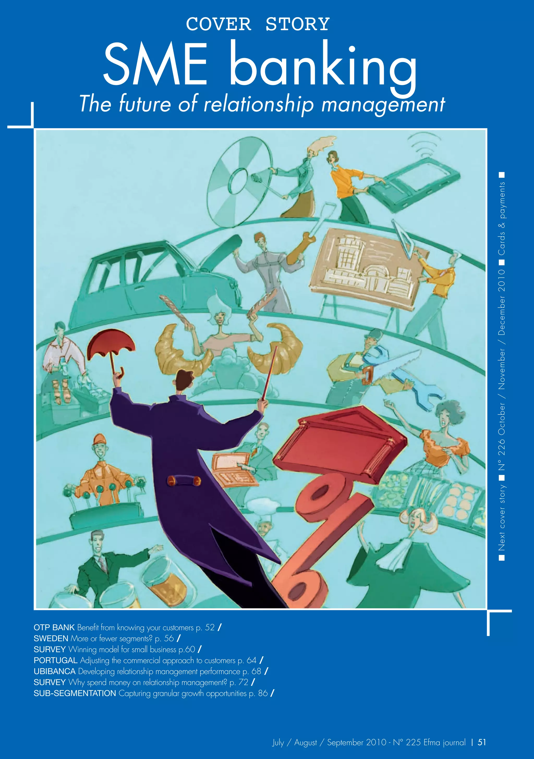 This document discusses relationship management in SME banking. It describes how OTP Bank in Romania conducted segmentation analysis of their SME customers to better understand them and identify opportunities for growth. They separated customers into four segments based on profitability and behavior: green (most profitable), potential green, orange (largest but less profitable), and red (inactive). OTP then conducted research with green and potential green segments to improve satisfaction and loyalty. The document also discusses how SEB Bank in Sweden focuses on SME banking and applies segmentation, with a focus on acquiring new customers and upselling existing ones. It emphasizes the importance of the SME segment and describes strategies for different sub-segments.