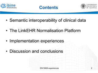 The document discusses experiences implementing the CEN EN13606 normalization framework for semantic interoperability of clinical data across three hospitals in Spain. It describes defining clinical archetypes, normalizing legacy data according to archetypes, and communicating electronic health record extracts between hospitals using CEN EN13606 standards. The experiences show that archetypes can be developed in a few hours and legacy data normalized to standardized documents in a day using available tools. Both strengths and weaknesses of CEN EN13606 are discussed.