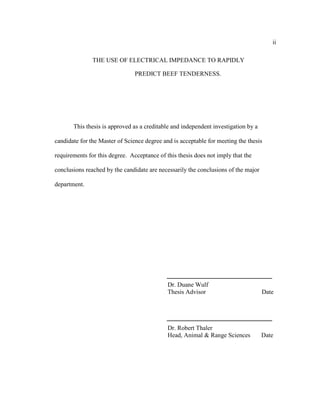 This document is a thesis submitted by Timothy Mark Nath in partial fulfillment of the requirements for a Master of Science degree in Animal Science from South Dakota State University in 2008. The thesis investigates using electrical impedance to rapidly predict beef tenderness. It is approved by Nath's thesis advisor and the head of the Animal and Range Sciences department. The thesis will consist of three phases to determine the usefulness of electrical impedance for predicting beef tenderness by examining optimal measurement locations, comparing it to existing technologies, and evaluating the impact of breed type, suspension method, and aging.