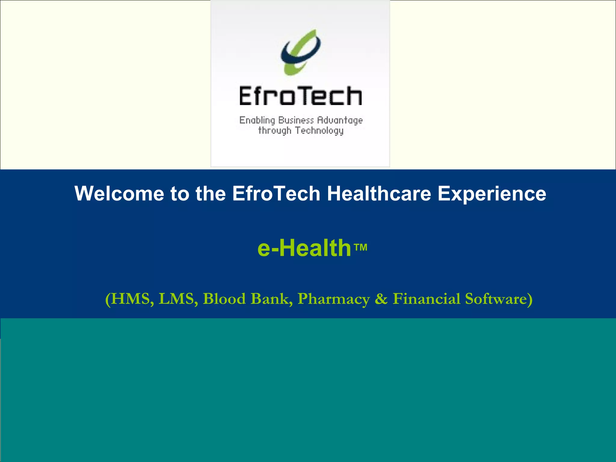 The document presents Efrotech's e-health tm, an integrated healthcare management system designed for hospitals and healthcare facilities, covering various departments and functions. It emphasizes real-time operations, high data quality, and enhanced inventory management along with comprehensive financial and human resources solutions. Efrotech has been providing these services since 1997 and claims to serve over 500 clients in the healthcare sector.