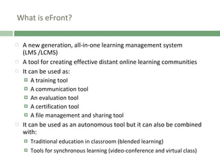 eFront is an all-in-one learning management system that can be used for online training, communication, evaluation, certification, and file sharing. It has tools for building lessons, tests, and organizing content. eFront is offered both as software to install on your own infrastructure, or as a hosted service. It has different editions tailored for different user needs, from individuals and small businesses to large enterprises.