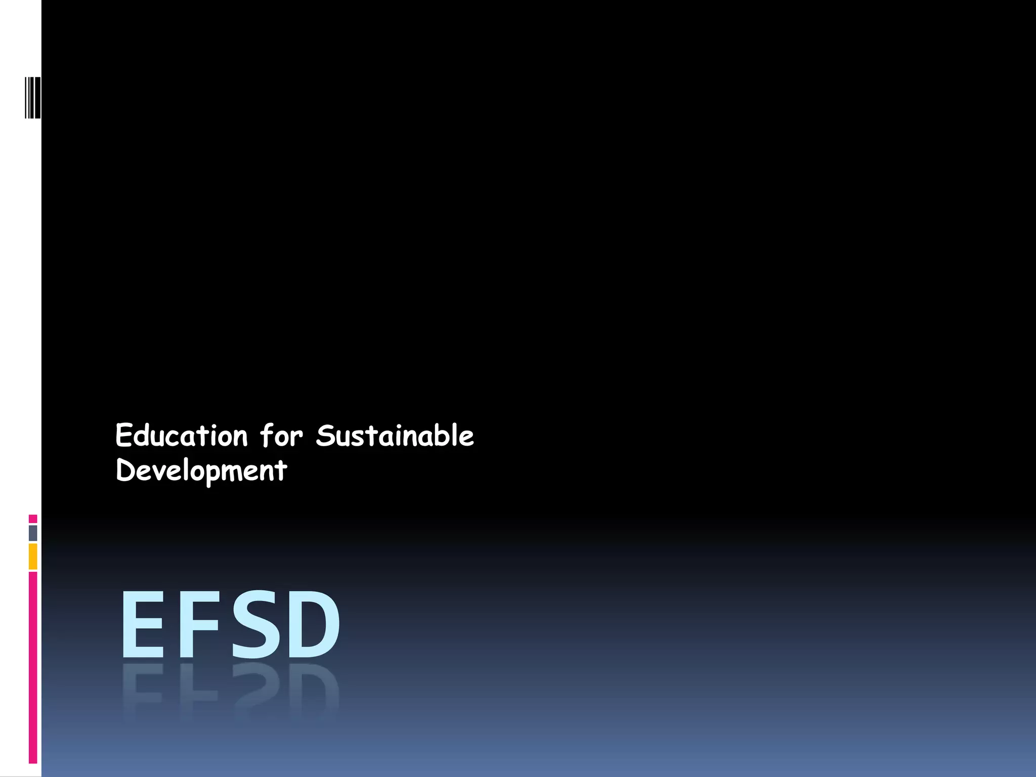 Pendidikan untuk Pembangunan Berkelanjutan (EFSD) bertujuan untuk meningkatkan kesadaran akan dampak pertumbuhan populasi dan perkembangan teknologi terhadap lingkungan. Inisiatif ini dipromosikan oleh Prof. Dr. Hans J. A. Van Ginkel dari UN dan mencakup dimensi ekonomi, lingkungan, dan sosial. Tujuan akhirnya adalah menciptakan pembangunan yang memenuhi kebutuhan saat ini tanpa mengorbankan generasi mendatang.