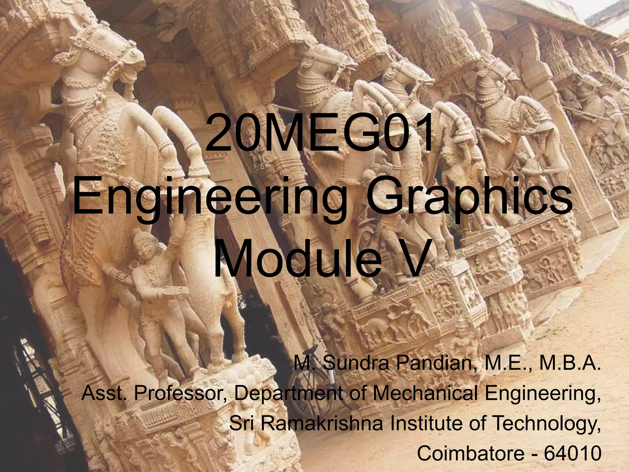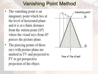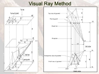 The document provides information on isometric and perspective projections in engineering graphics. It defines isometric projection as a type of pictorial projection that shows the actual sizes of all three dimensions of a solid in a single view. It also defines perspective projection as representing how an object would appear to the eye from a fixed position. The document then discusses principles, scales, views and methods of isometric projection. It provides examples of isometric views of basic geometrical shapes. It also discusses the principles and methods of perspective projection like visual ray and vanishing point methods.