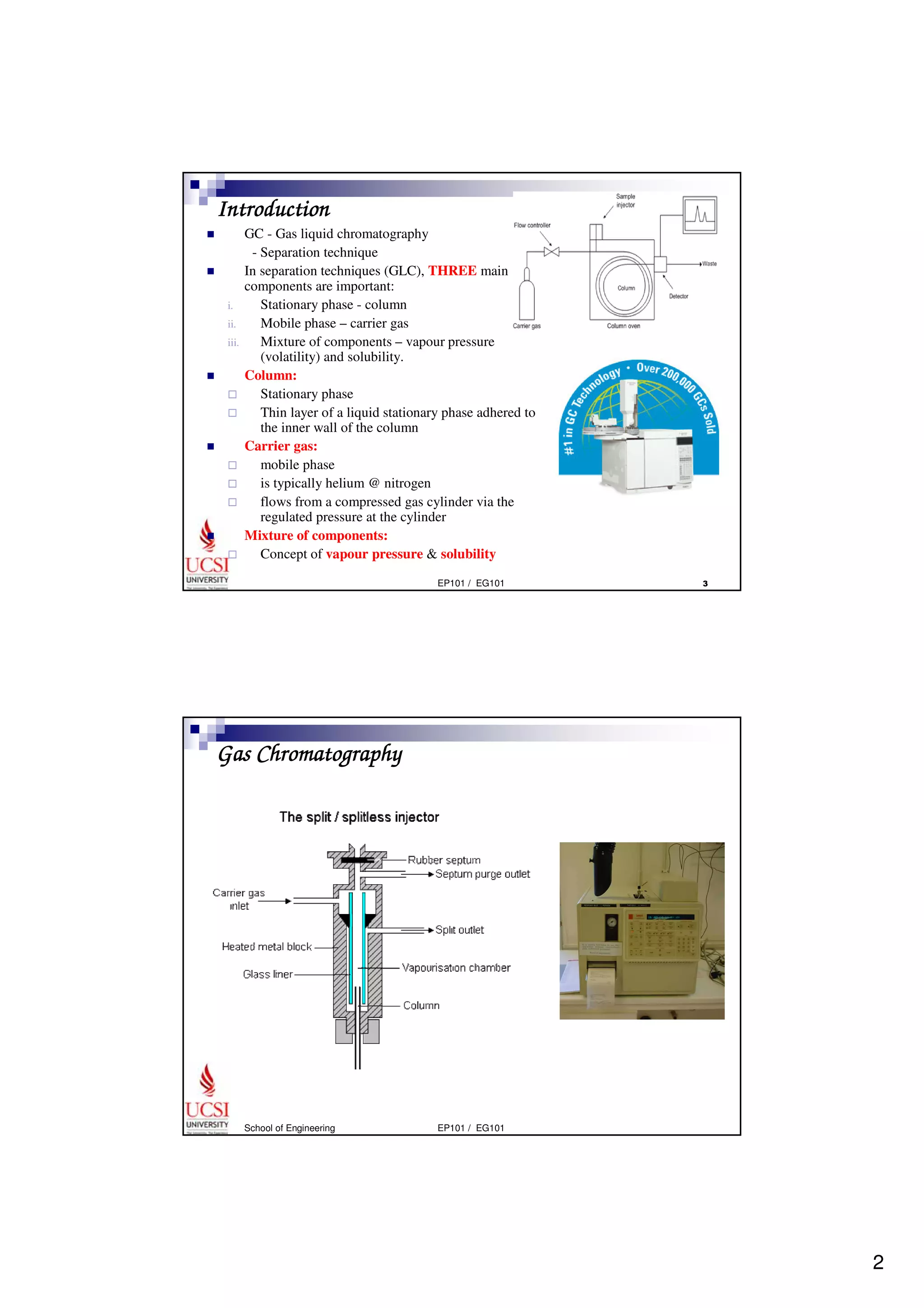 Gas chromatography (GC) is a separation technique that uses a stationary phase coated on the inside of a column and a carrier gas as the mobile phase. The mixture of components is injected and separates into individual components as they travel through the column at different rates depending on their volatility and solubility. GC can be used to qualitatively and quantitatively analyze mixtures by measuring the retention times and peak sizes/areas of the separated components detected by the instrument. Key components of a GC system include the injector, column, detector, and recorder/integrator.