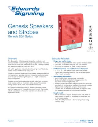 The document is a data sheet for the Genesis line of life safety speaker-strobes, highlighting their compact design, field configurability, and superior performance. These devices offer adjustable wattage and candela settings, ensuring they meet various ambient noise requirements and are compliant with safety standards. Additionally, installation is straightforward, requiring no visible mounting screws, and the devices provide essential features such as clear audio output and synchronized strobe capabilities for visual notification.