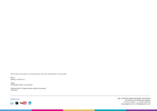 This document is the Code of Conduct on Interactions with the Healthcare Community from the European Generic Medicines Association (EGA). The code provides guidelines for generic drug companies on their interactions with patients, healthcare professionals, and organizations. It covers topics like educational support, meetings/hospitality, sponsorship, and transparency. The code aims to ensure interactions are ethical and that companies disclose transfers of value as required by transparency rules.