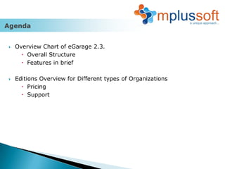 This document provides an overview of the eGarage 2.3 software solution. It includes a chart outlining the overall structure and brief features. It then discusses editions for different organization types, including pricing and support. Finally, it details the key features within modules for office administration, accounts, payroll/HR, staff interface, and client interface. The features provide functionality for job cards, billing, attendance, scheduling, and more.