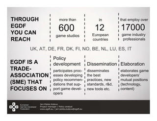 The document discusses how digital games are drivers of business and innovation in Europe. It summarizes that the digital games industry employs over 17,000 professionals across 12 European countries. Digital games are highlighted as an economic, cultural, and innovation driver. They spur technological advances in areas like hardware, networking, and new business models. The games industry has experienced a shift to digital distribution and online games. However, game development remains risky with only 5% of games profitable. Political support is needed to help small game studios scale and access digital markets through tools, standards, and flexible regulation.