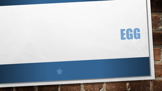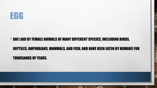 - Eggs are laid by many species and have long been consumed by humans. They consist of a shell made of calcium carbonate with pores, two inner protein membranes, an air cell, egg white (albumen) made of many proteins, strands (chalazae) that hold the yolk, a clear vitelline membrane surrounding the yolk, and a nutrient-rich yolk.