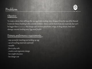 This document describes an egg drop project where the objective is to design a device that protects a raw egg when dropped from a tall building. The design must be made of recycled materials, be reusable, and not exceed 2'x2'x2' in size. It cannot include parachutes, wings, or drag devices. The design is evaluated on criteria like easy egg access, fun playability, low weight, and low cost. The document includes sketches, mockups, prototypes, and instructions for the final design, which consists of blue and red twisted pipes held in a foam ring to cradle the egg. Initial tests showed the need for pipe spacing and an additional pipe layer, and different holders were tested before choosing foam.