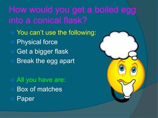 Nurul, Usman, Ali, and Imran present an experiment to demonstrate how to get a boiled egg into a conical flask using only matches, paper, a heatproof mat, safety goggles, and the flask and egg. The instructions explain that lighting a strip of paper on fire inside the flask will cause the heated air to expand and suck the egg into the flask once the fire is extinguished and the air cools and contracts, creating a vacuum.