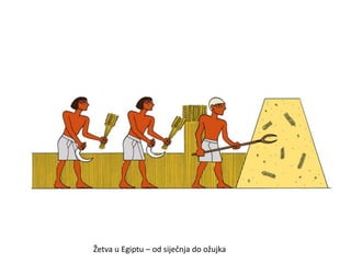 Dokument se fokusira na Egipat, njegovu žetvu i važnost rijeke Nil u kalendaru i poljoprivredi. Opisuje društvenu i političku strukturu, uključujući vladare, dinastije i značaj žene kao vladarice. Također se spominju kulturni aspekti poput religije i znanosti koje su se razvile u Egiptu.