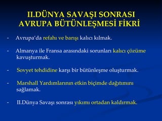 II.DÜNYA SAVAŞI SONRASI AVRUPA BÜTÜNLEŞMESİ FİKRİ Avrupa’da refahı ve barışı kalıcı kılmak. Almanya ile Fransa arasındaki sorunları kalıcı çözüme kavuşturmak. Sovyet tehdidine karşı bir bütünleşme oluşturmak. Marshall Yardımlarının etkin biçimde dağıtımını sağlamak. II.Dünya Savaşı sonrası yıkımı ortadan kaldırmak.