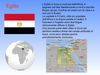 L'Egitto, situato nel nord-est dell'Africa, è bagnato dal Mar Mediterraneo e dal Mar Rosso, con una capitale al Cairo e una popolazione di circa 70 milioni di abitanti. Il Nilo, il fiume più lungo del mondo, è cruciale per l'uso idrico e l'economia, precedentemente basata sull'agricoltura e attualmente orientata verso il turismo. Il 95% del territorio è desertico e la società è prevalentemente musulmana, con una significativa comunità copta.