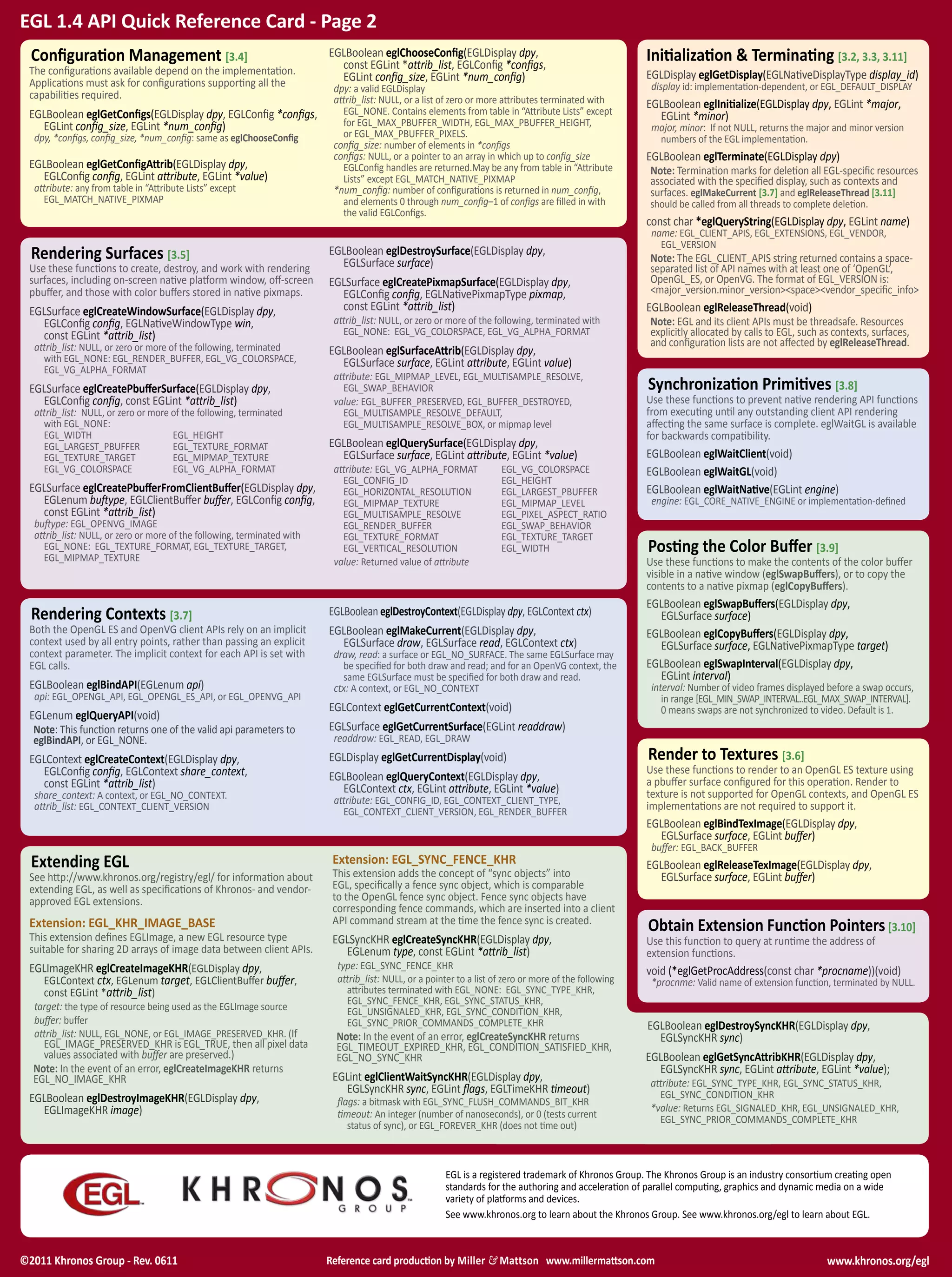 The document then provides details on EGL types, errors, attribute lists, rendering contexts, synchronization, and extensions. It includes functions for initialization, surface management, context creation/deletion, rendering, and more. Tables define attributes for config selection and a reference for common error codes.