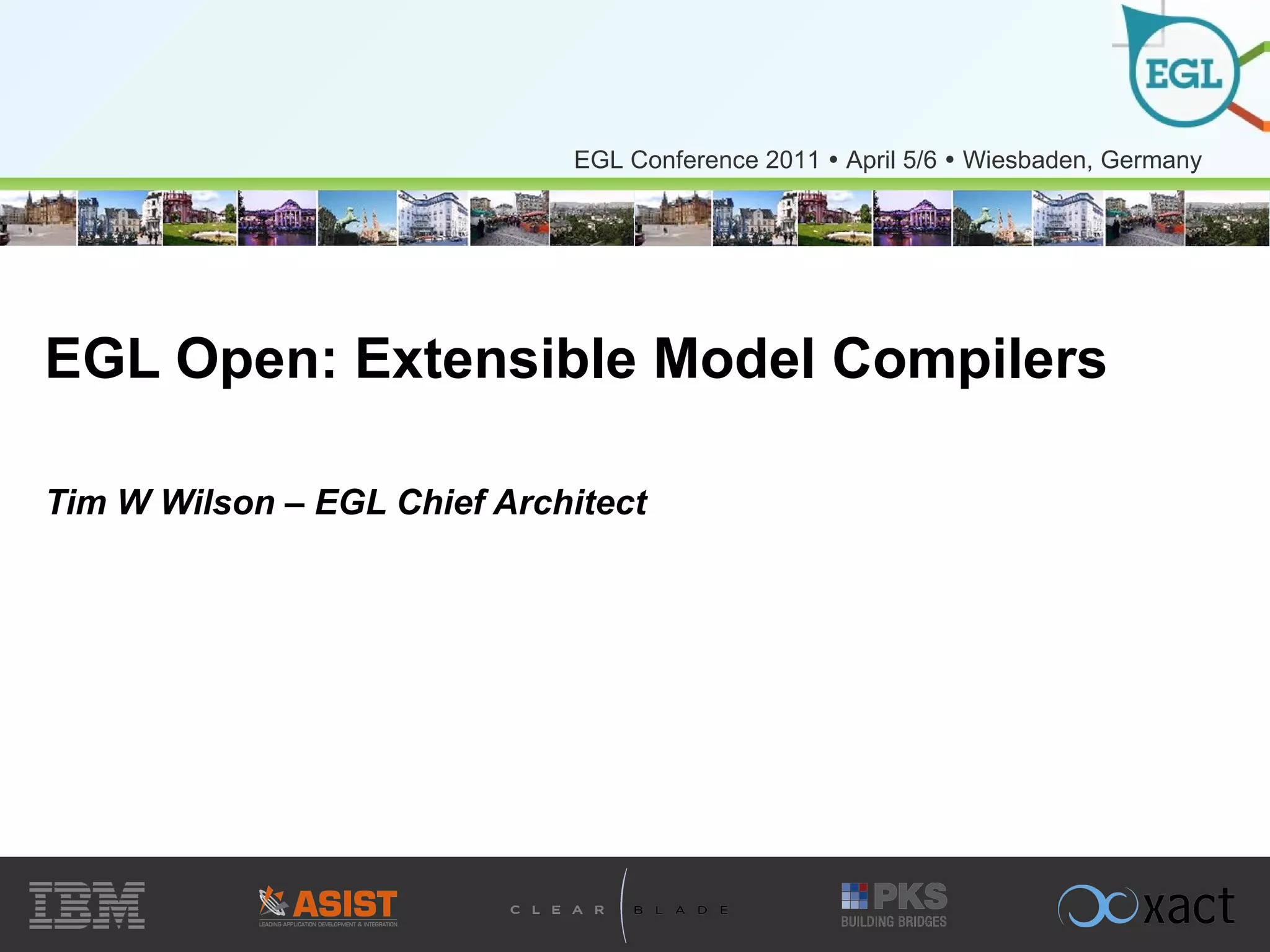The document discusses the evolution and features of the EGL (Enterprise Generation Language) as an extensible model compiler, highlighting concepts such as metadata, data typing, and program structure that are foundational in defining models. It outlines the architecture of the EGL compiler, its extensibility through templates, and how it integrates with various programming environments while allowing for transformations and code generation specific to targeted runtimes. Additionally, tools like xtool and xref are introduced for managing EGL code, versioning, and handling dependencies, alongside providing interfaces for building and maintaining EGL applications.