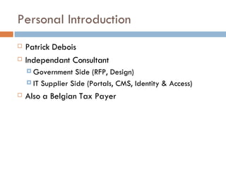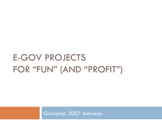 The document discusses tactics for making e-government projects more successful using agile methods like Scrum. It outlines several agile tactics including prioritizing functionality, releasing often in short sprints, planning as a team, focusing on delivering working software frequently, improving communication, and gaining feedback to continuously improve. The author argues these agile tactics can help e-gov projects deliver on time and on budget while being more fun for those involved.