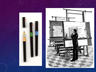 This document discusses the basic tools used for technical drawing and engineering graphics (EG). It describes commonly used drawing tools like pencils, drawing boards, T-squares, rulers, scales, compasses, and drafting machines. It also provides details on the different types of planes (perpendicular and oblique) and how they are projected, including examples of planes positioned perpendicular to and inclined from the horizontal and vertical planes.