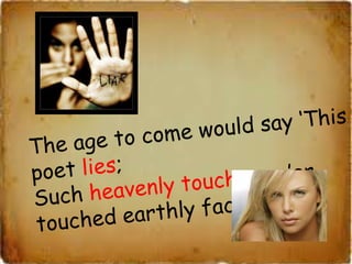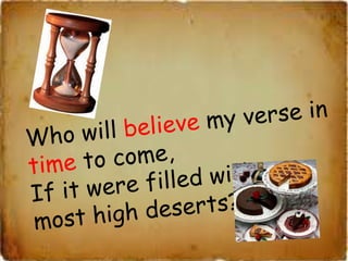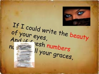 Sonnet 17 expresses the poet's hope that his verse will make him immortal by surviving into future times for readers to enjoy, as his physical beauty will fade with age but his poems will live on in books even after his death. It focuses on the contrast between the transience of human life and the permanence of written poetry as a means of achieving remembrance.